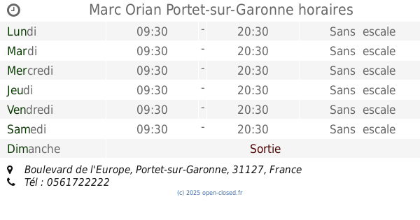 It is also possible to : Modifier ces HEURES D'OUVERTURE of Store Marc Orian Dans Portet-sur-Garonne, Boulevard de l'Europe,